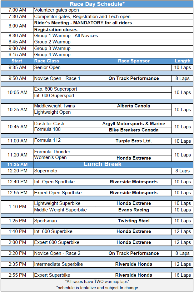 RAD Torque Raceway Race day Schedule(subject to change)